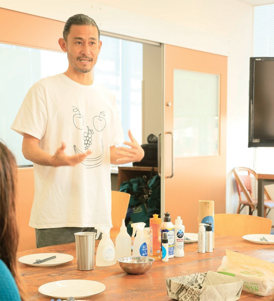 この洗剤学校では、All in One 洗剤「All things in Nature」のディレクター堀直也氏を講師に迎え、洗剤の正しい知識と使い方を楽しく学べます。