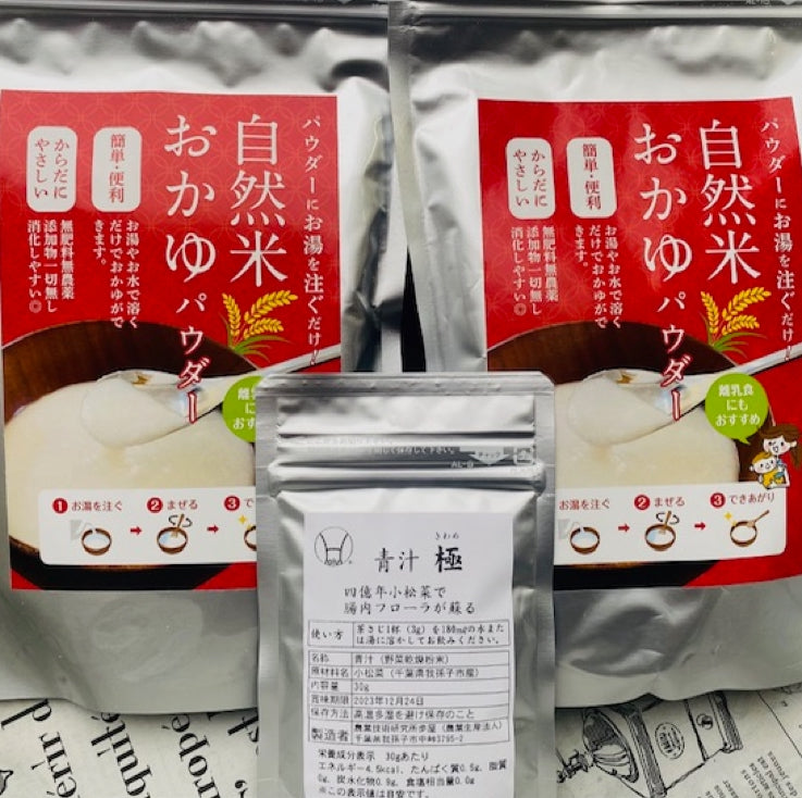 自然米のアルファ化玄米粥(200g)×2袋、青汁「極」30g×1袋